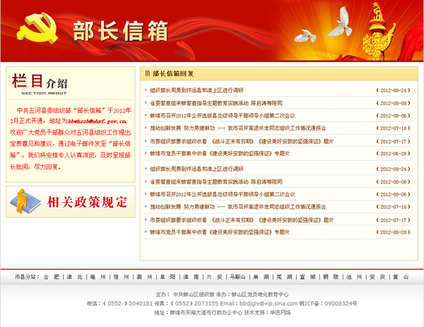 中共五河縣委組織部“部長(zhǎng)信箱”于2012年2月正式開通,地址為bbwhzzb@ahxf.gov.cn。歡迎廣大黨員干部群眾對(duì)五河縣組織工作提出寶貴意見和建議,通過電子郵件發(fā)至“部長(zhǎng)信箱”,我們將安排專人認(rèn)真瀏覽,及時(shí)呈報(bào)部長(zhǎng)批閱,盡力回復(fù)。